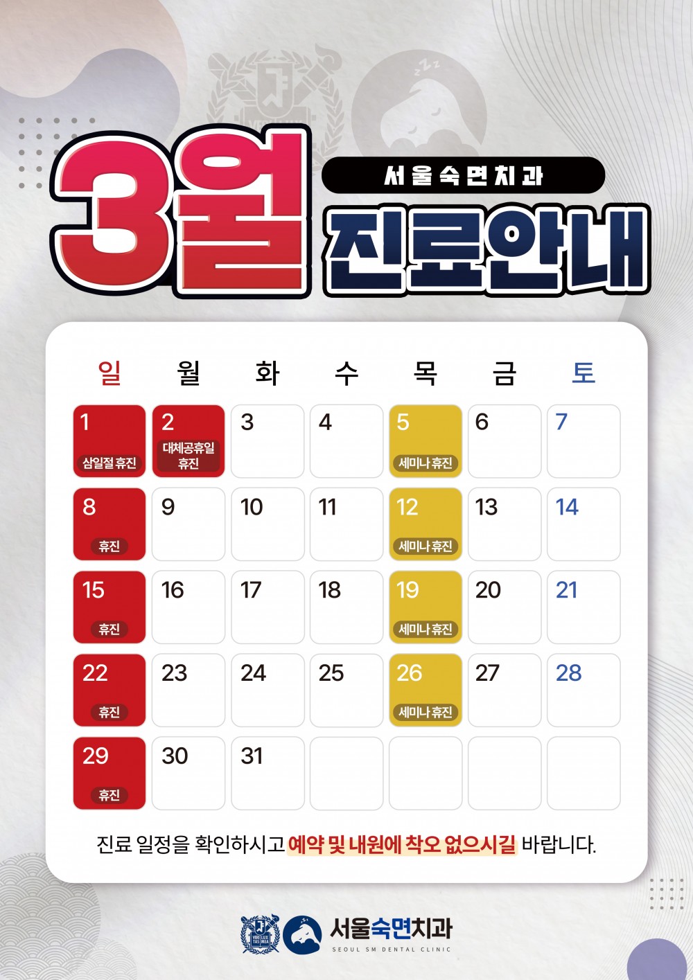 서울숙면치과 3월 진료일정 안내드립니다.